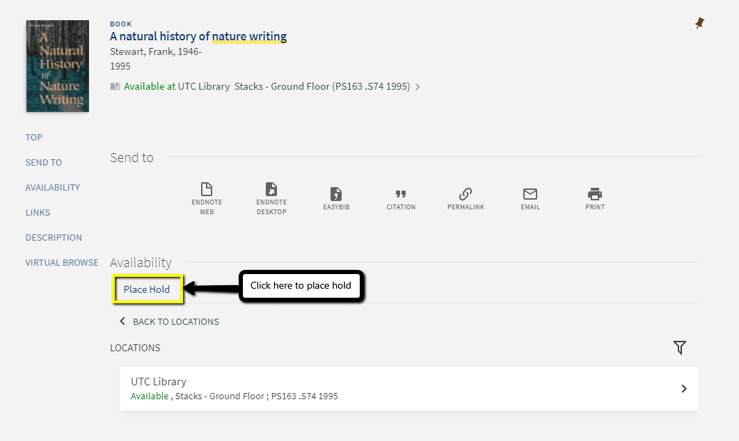 When you find an item you want, click on the title to see the item details. Under Availability, click on “Place Hold.”