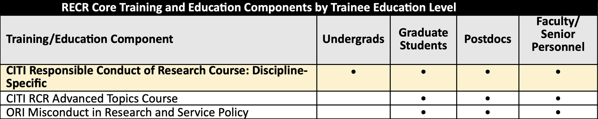 People who are subject to the requirements for RECR training are expected to complete core training appropriate to their educational level, as noted below. The Principal Investigator or Project Director for each NSF award may identify additional optional training requirements based on the type(s) of research to be conducted.