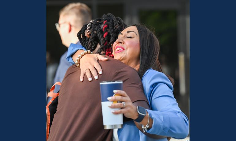 Principal Arielle Hayes hugs Kambriah Reynolds after the graduating senior spoke on behalf of the first cohort of University High...